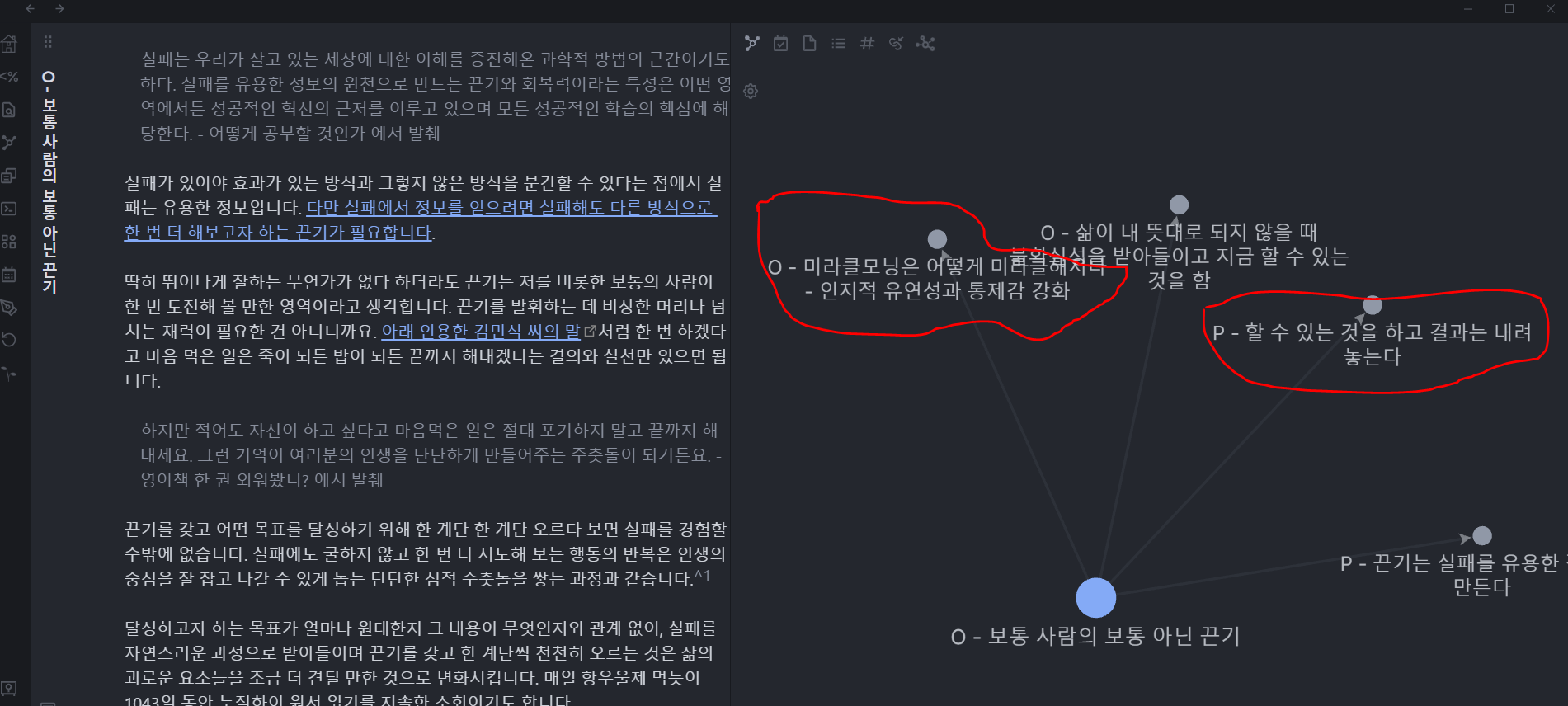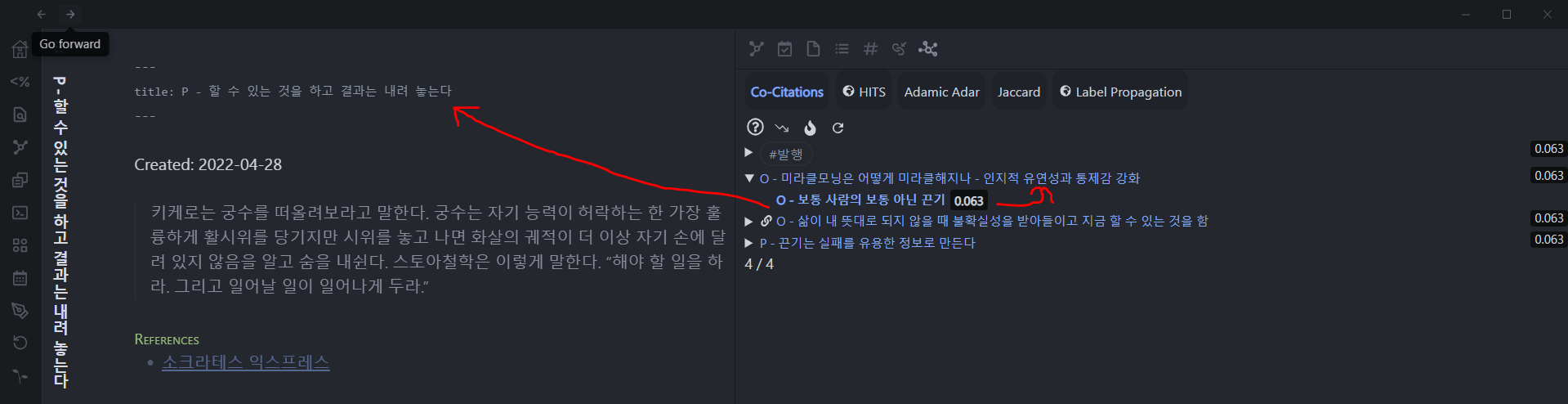Co-Citations: 이건 개념적으로 이해하는 데 시간이 좀 걸렸는데, 아래 예시를 보시면 쉽습니다. [[P - 할 수 있는 것을 하고 결과를 내려 놓는다]] 노트와 [[O - 미라클모닝은 어떻게 미라클해지나 - 인지적 유연성과 통제감 강화]] 노트가 공통적으로 포함하는 백링크가 바로 [[O - 보통 사람의 보통 아닌 끈기]]입니다.