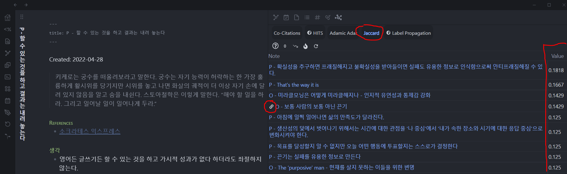 Jaccard: 그래픽뷰의 구조에 근거하여 수학적으로 현재 노트와 가장 상관이 높은, 즉 유사한 노트를 내림차순으로 보여주는 화면입니다. 현재 노트와 연결이 돼 있다면 링크 표시가 뜹니다. 링크 표시가 없는 것은 연결이 안 돼 있다는 뜻이기 때문에, 현재 노트와 유사한 다른 노트를 연결하고 싶을 때 유용합니다.