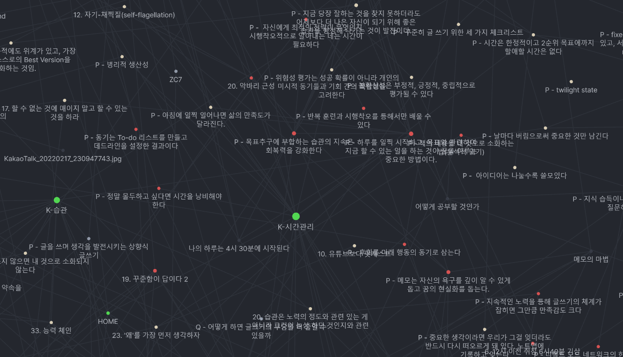 아래와 같은 느낌이죠. 전체 노트에 대한 제 그래픽뷰의 일부입니다. 저는 데탑이 없고 노트북으로만 작업하기 때문에 작은 모니터화면으로 저런 화면을 보는 것에는 상당한 피로도가 수반됩니다. 개별 노트의 그래픽뷰를 depth 2 수준으로 낮춰도 비슷합니다.