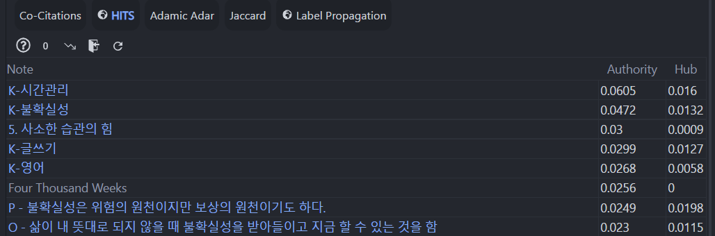 HITS: 마지막으로 이 기능은 한 노트가 얼마나 많은 백링크(혹은 inbound link)와 outbound link를 갖고 있는지를 알려줍니다. 아직 공부가 더 필요한 부분이지만 백링크가 많다는 것은 그 노트가 그만큼 전체 노트에서 핵심적이라는 이야기일 수 있고, outbound link가 많다는 것은 여러 가지 생각으로 발전할 수 있는 가능성을 지닌 분화가 덜 된 추상적 개념을 의미할 수 있습니다. 후자는 제가 제대로 이해한 것이 맞는지 모르겠으니, outbound link가 많다는 것의 의미가 무엇인지 가르쳐 주시면 감사하겠습니다. 아무튼 아래 제 옵시디언 화면의 Authority 점수 보시면 제 옵시디언 볼트의 핵심이 시간관리, 불확실성, 사소한 습관, 글쓰기, 영어 다섯 가지 키워드임을 알 수 있습니다.