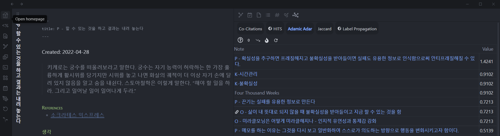 Adamic Adar: 이 역시 그래픽뷰의 구조에 기반하여 연결되어야 하는(should be linked) 노트를 내림차순으로 보여주는 화면입니다. Jaccard와 비슷하면서도 좀 다르죠? 현재 K-시간관리, K-불확실성 같은 키워드 중심의 분류는 하지 않고 있습니다. 태그로 노트를 분류하는 게 가장 효과적인 것 같다는 판단에서입니다. 하지만 아래 화면 캡처한 것에는 K-시간관리와 K-불확실성에 연결하라고 뜨죠? 좌측 노트의 내용을 보면 불확실성이 시간관리보다 더 알맞은 키워드이지만, 시간관리도 '미래를 예측하여 통제하려는 데 과도하게 시간 쏟지 말고 현재에 충실하라'는 관점에서 보면 맥락이 어긋나는 키워드가 아닙니다. 실제로 제 노트 중 일부가 저런 관점에서 쓰여졌고요. 이처럼 그래픽뷰의 구조에 근거하여 현재 노트를 어디 연결하면 좋을지 수학적으로 판단해주는 것이 Adamic Adar입니다.